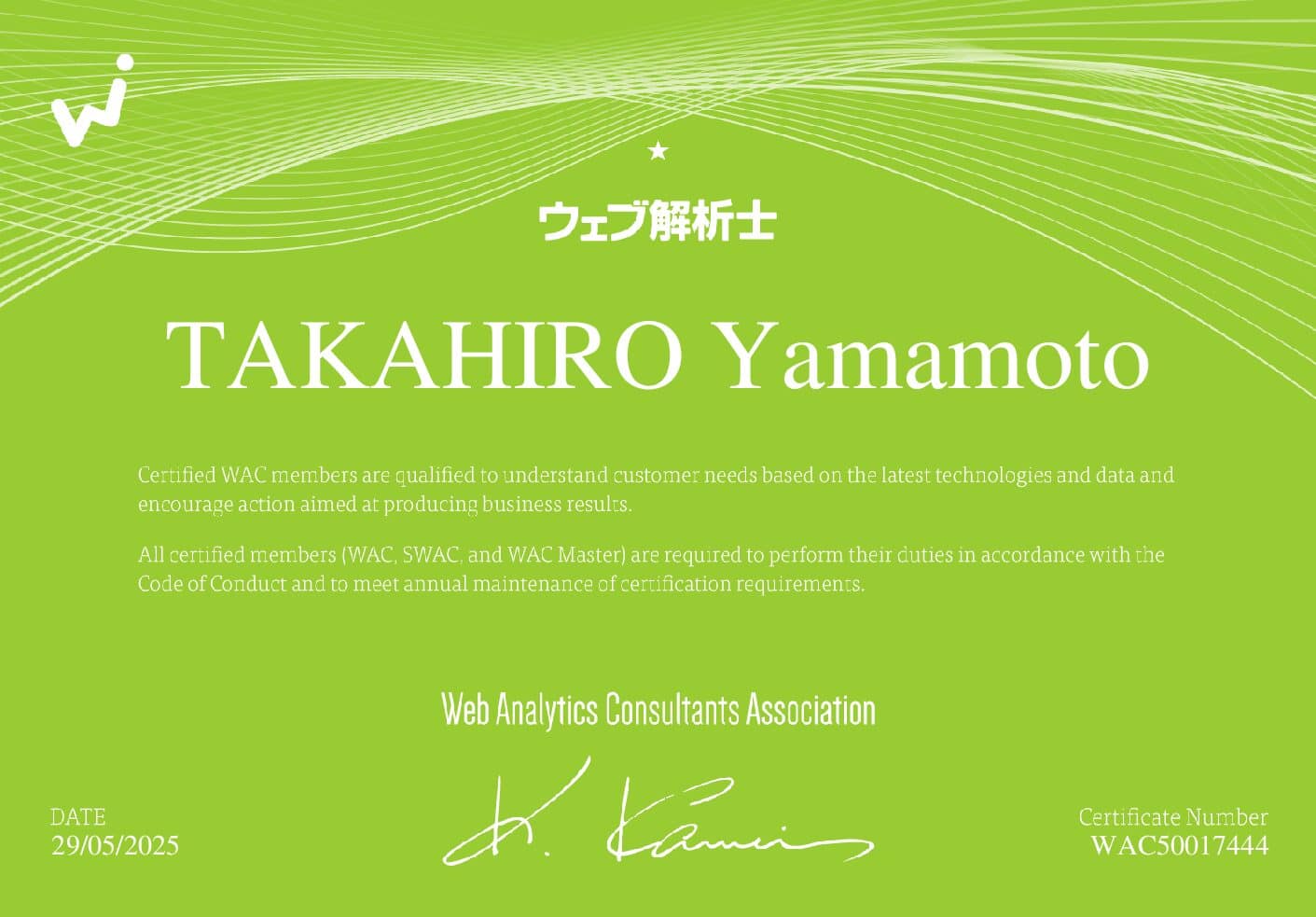 一般社団法人ウェブ解析士協会(https://www.waca.or.jp )が認定するウェブ解析士の試験で1名の合格者(認定)がありましたのでお知らせします。あわせて一般社団法人ウェブ解析士協会の正会員で参画しました。