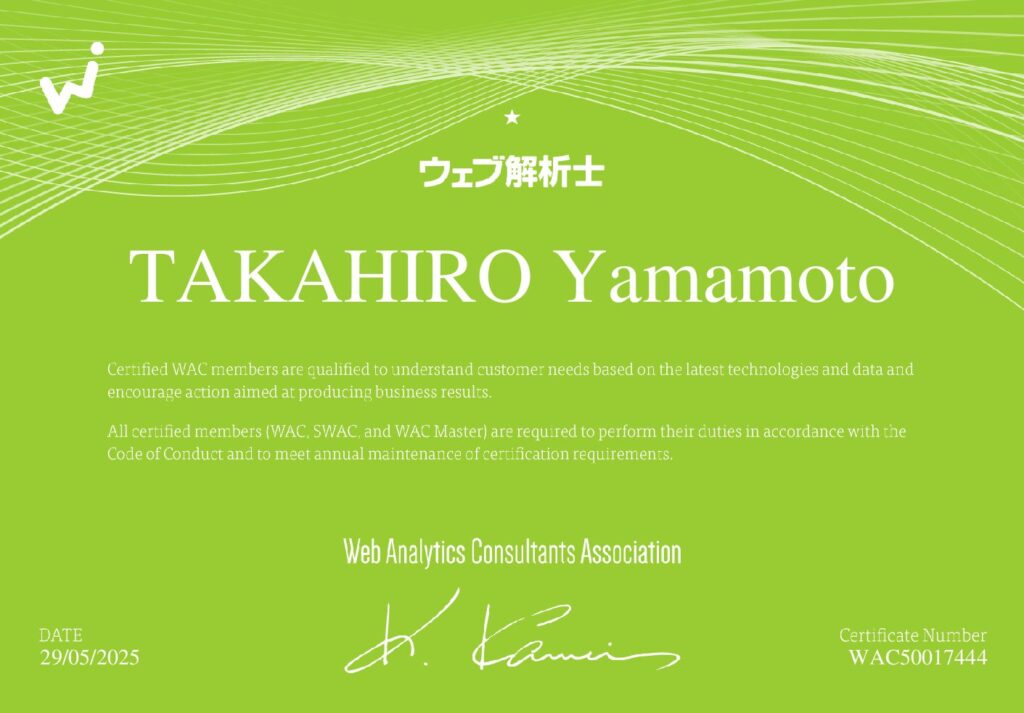 一般社団法人ウェブ解析士協会が認定するウェブ解析士に1名の合格者(認定)が出ましたのでお知らせします。あわせて一般社団法人ウェブ解析士協会の正会員で参画しました。